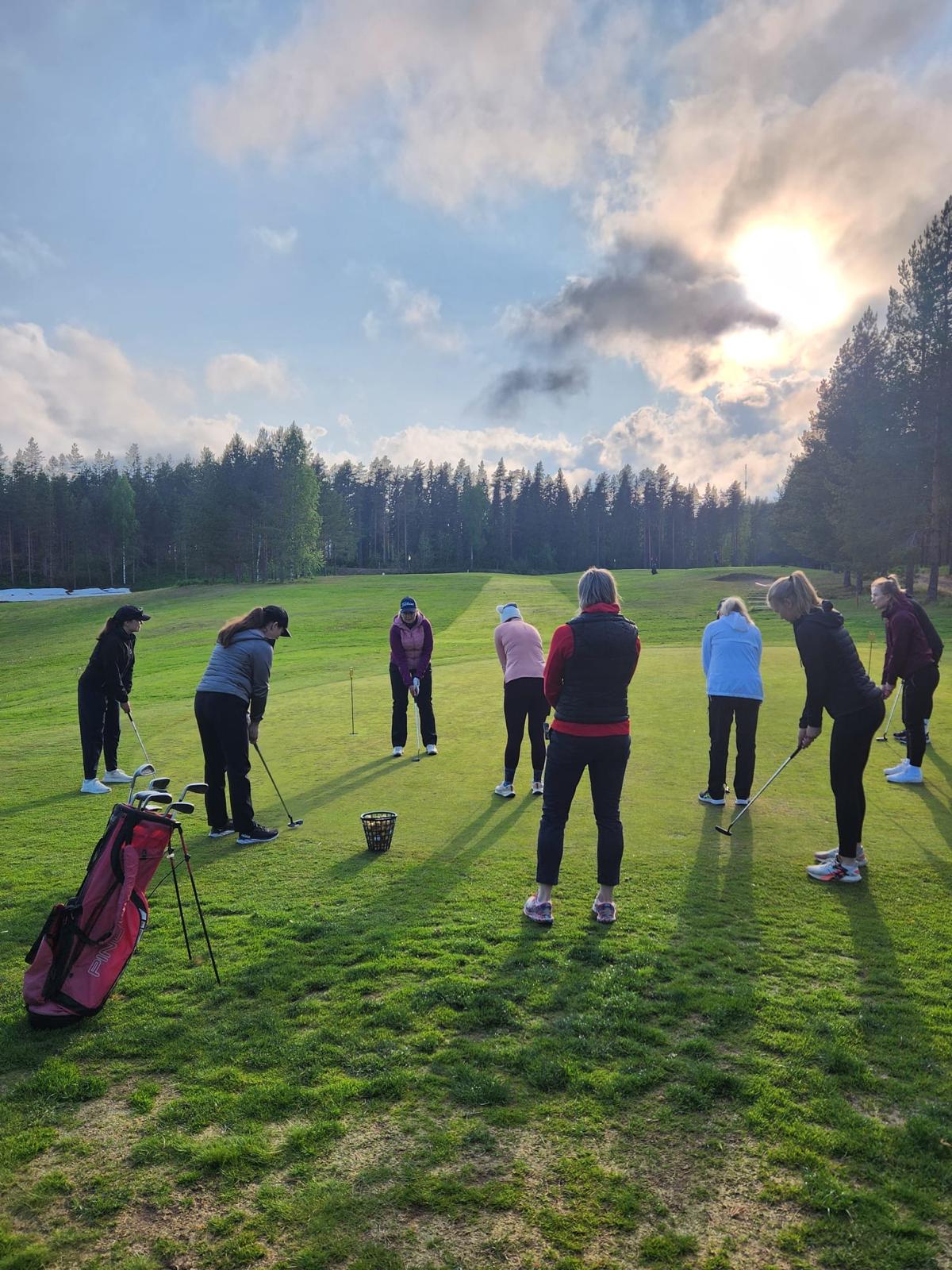 Golfiin tutustumista Pro Harri Thilin johdolla rangella ja lähipelialueella.